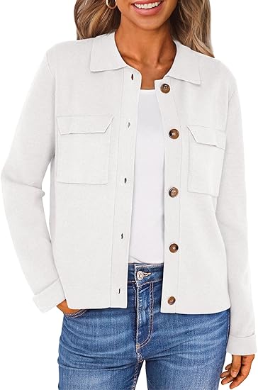 Women's Open Front Cropped Cardigan Long Sleeve Button Down Shackets Jacket Knit Patch-Pocket Merino Sweater Jacket