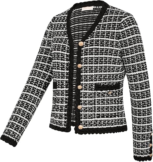 Women Cardigan Sweaters Tweed Pattern Jacket V Neck Sweater Blazer with Button for Fall Winter Spring